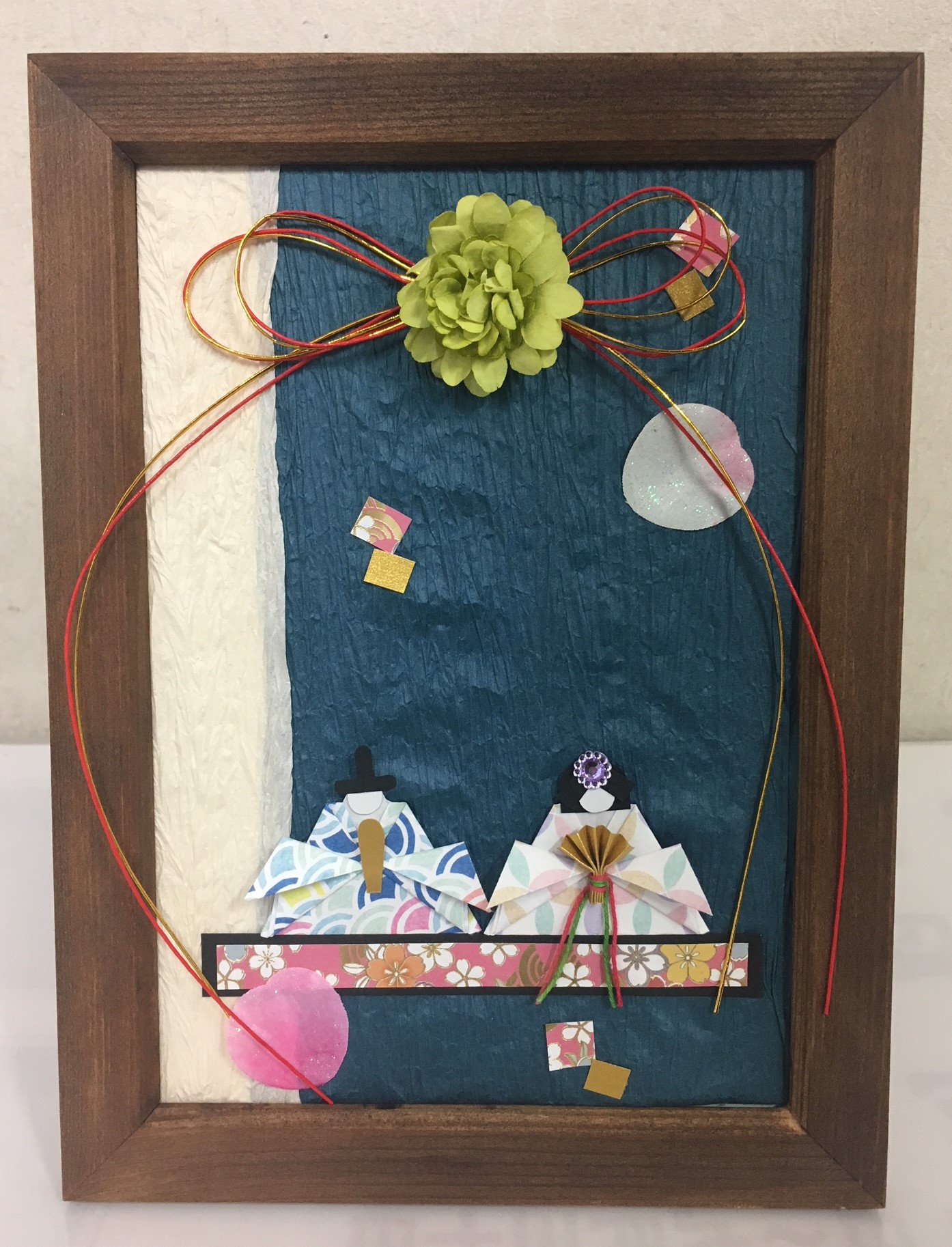 A5サイズの額縁に、折り紙で作るお雛様を中心に好みの飾りつけをして気軽に飾れる自分だけの